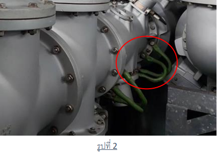 จากนั้นก็ใช้สายทดสอบที่ต่อจาก DCM Module คีบที่สายทดสอบด้านหนึ่งที่ขั้ว Terminal ดังรูป และ ปลายสายทดสอบของ DCM อีกด้านที่เหลือ นำไปคีบที่โครงโลหะของ GIS ในตำแหน่งที่ไม่มีสีเคลือบ จากนั้นติดตั้งสายทดสอบจนครบ 3 เฟส