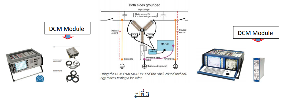 การจับเวลาการทำงานของ Circuit Breaker ภายใต้สภาวะการต่อลงกราวด์ทั้งสองด้าน ของ Circuit Breaker นั้น สำหรับผลิตภัณฑ์เครื่องทดสอบของ Megger จะใช้ เครื่อง Circuit Breaker Analyzer รุ่น TM1700 หรือ TM1800 ร่วมกับ DCM module ( Dynamic Capacitive Measurement ) ซึ่งเป็นลิขสิทธิ์เฉพาะของ Megger ดังรูปที่ 3