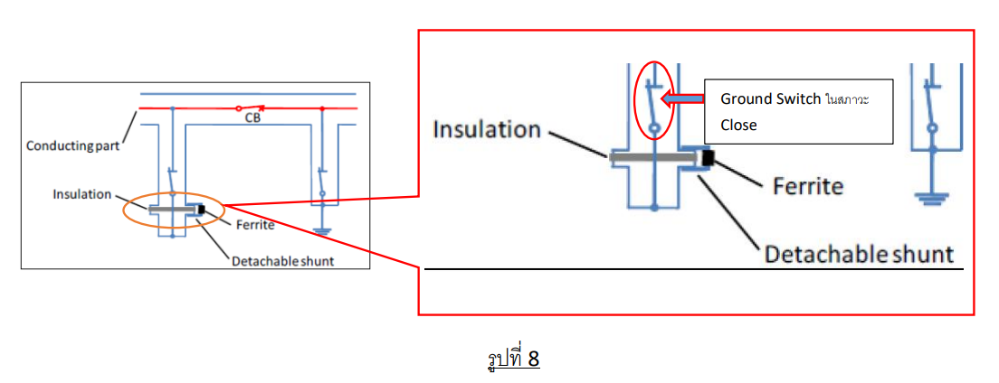 แต่ในกรณีของ Air Insulated Switchgear (AIS) นั้น ไม่มีความจำเป็นต้องใช้อุปกรณ์ Ferrite Kit เนื่องจาก Ground Loop มีความยาวกว่า Circuit Breaker Loop ดังตัวอย่างที่แสดงใน รูปที่ 7