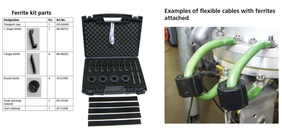 เราจึงสามารถใช้ประโยชน์จากคุณสมบัติดังกล่าวในการเพิ่มค่าอิมพีแอนซ์ของ Ground Loop ดังตัวอย่างในรูปที่ 6. ซึ่งจะแสดง Loop ของ Ground ด้วยเส้นสีแดง อุปกรณ์ Ferrite Kit มีความจำเป็นต้องใช้เมื่อ ค่าอิมพีแดนซ์ ของ Loop Ground ดังกล่าว